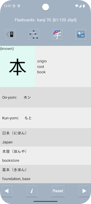 Currently, settings are limited to resetting all kanji to “unknown” and clearing the Repeat stack.