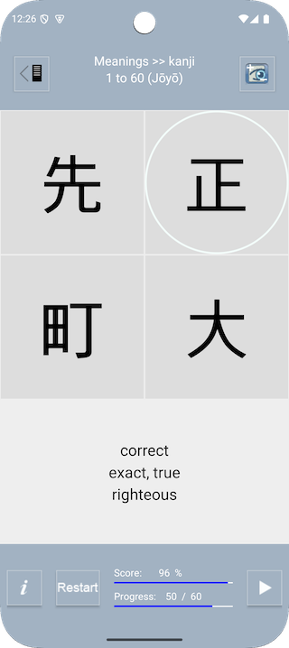 This application is the Android version of the web Java applet "Memorize Japanese kanji" that has been freely available since 2001, until browsers stopped supporting Java applets (2015 for Chrome, 2017 for Firefox).