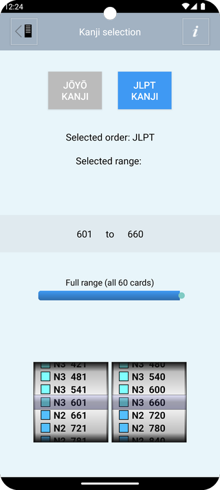 Depending on your choice in the "Select the kanji to study" panel, flashcards and drills follow the Jōyō Kanji order or the the five levels of the